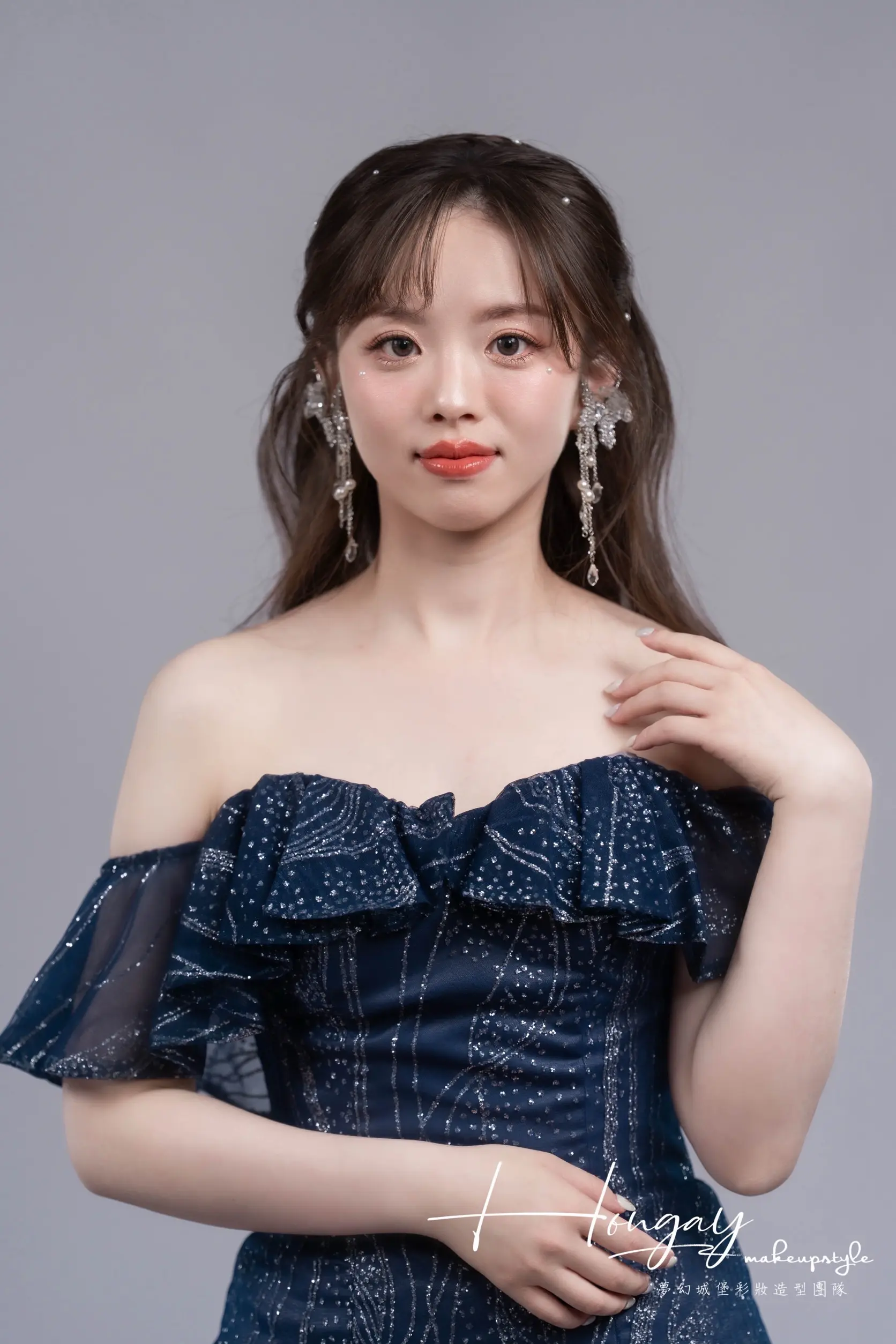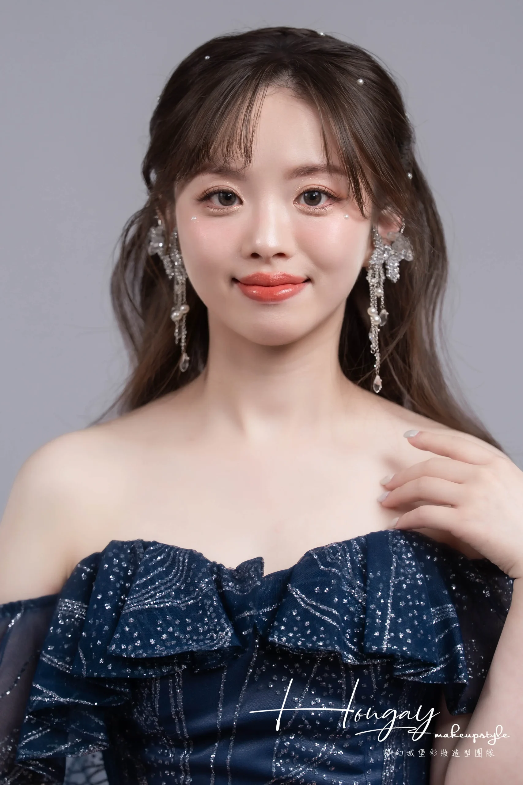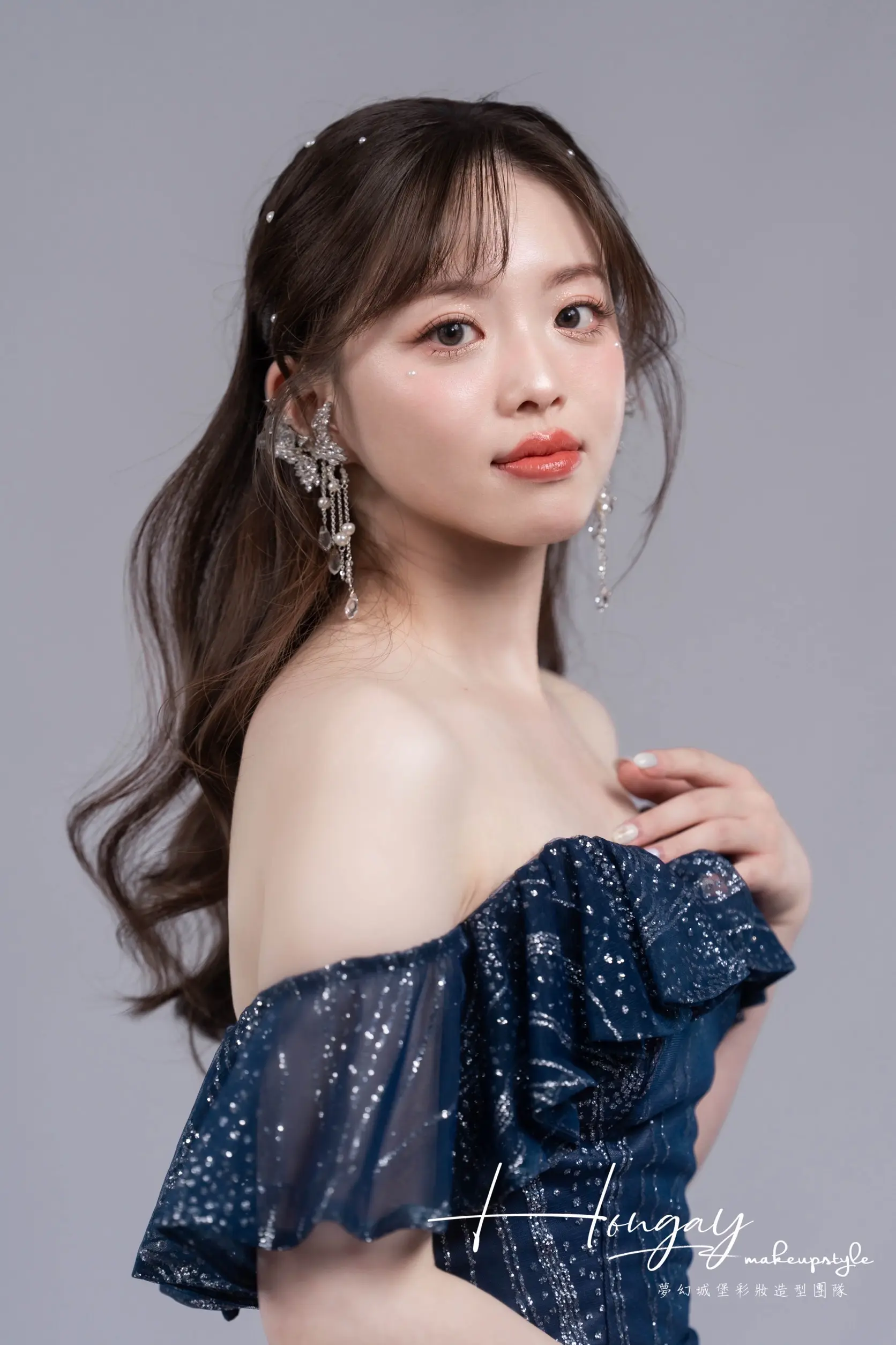 成熟色調禮服也能應用甜美的髮型及仙氣耳環襯托水水的氣質唷!