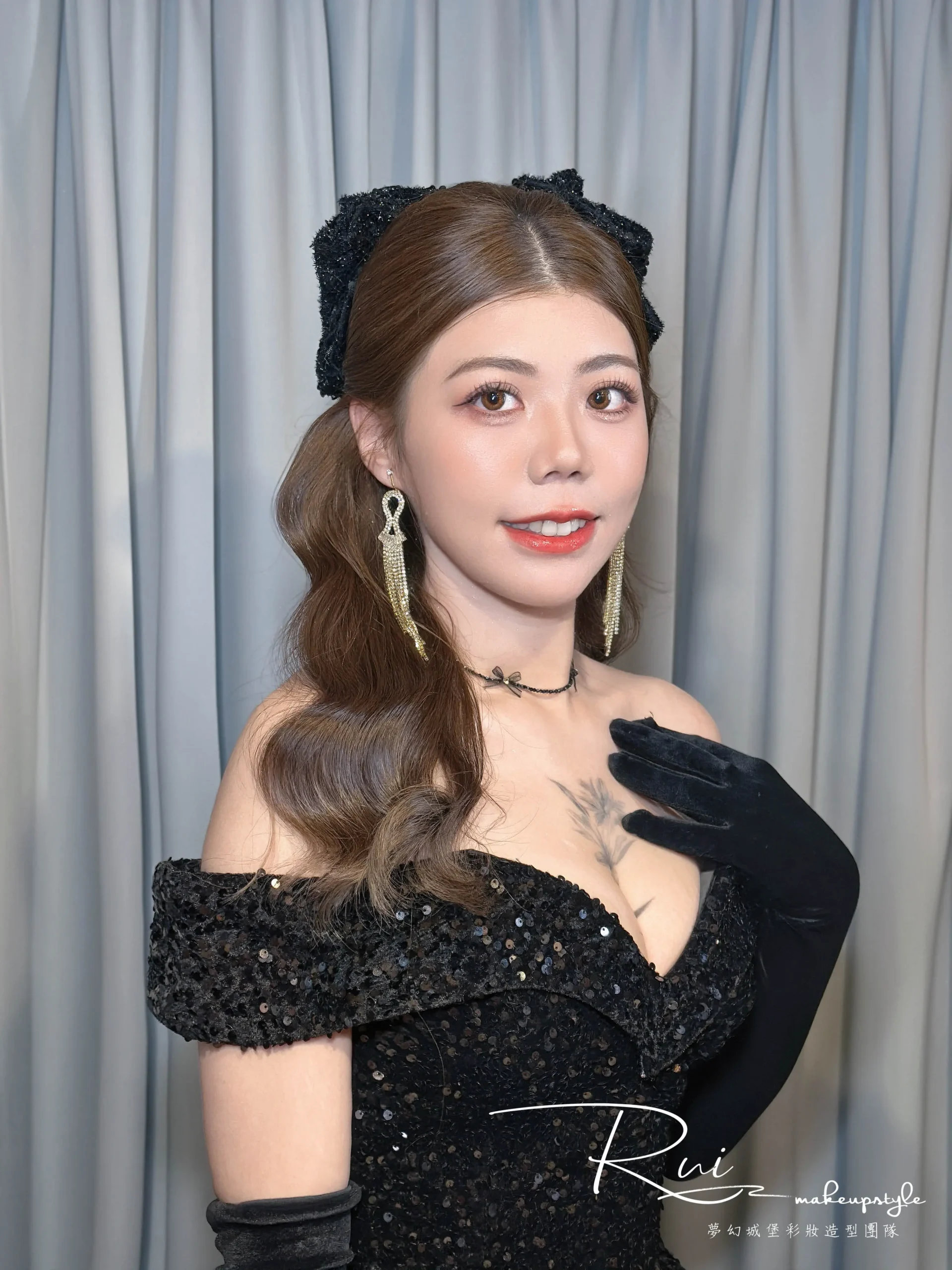 敬酒造型搭配手套、蝴蝶結頭飾 妥妥的小赫本千金風造型